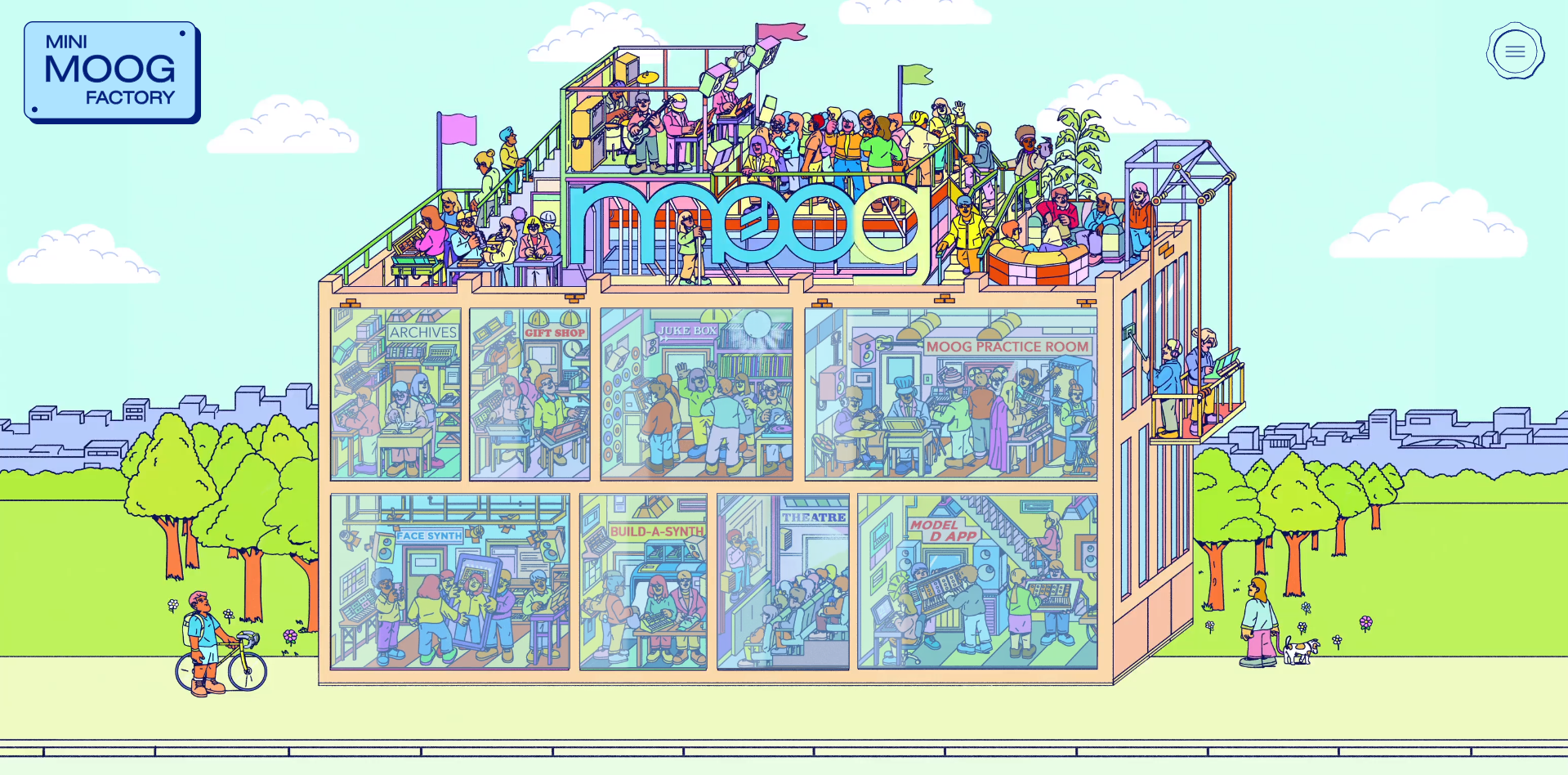 Inspirando-se nos jogos e sites dos anos 90, a Moog juntou-se à firma de design de topo de Nova Iorque, Pentagram, para criar uma viagem virtual pelo mundo do Minimoog Model D.